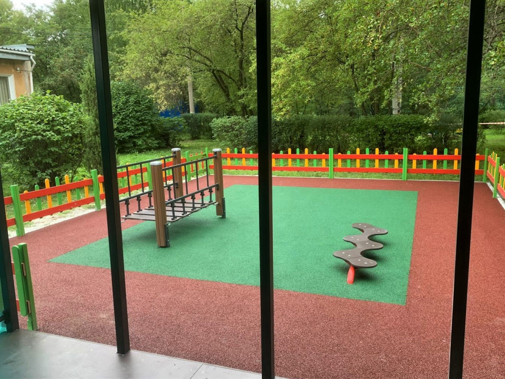 Площадка была создана для детей от 0 до 3 лет, она полностью безопасна, мы позаботились, чтобы малышам было комфортно играть. Площадка была обнесена забором с одной калиткой, чтобы воспитателям было легче следить за детьми.