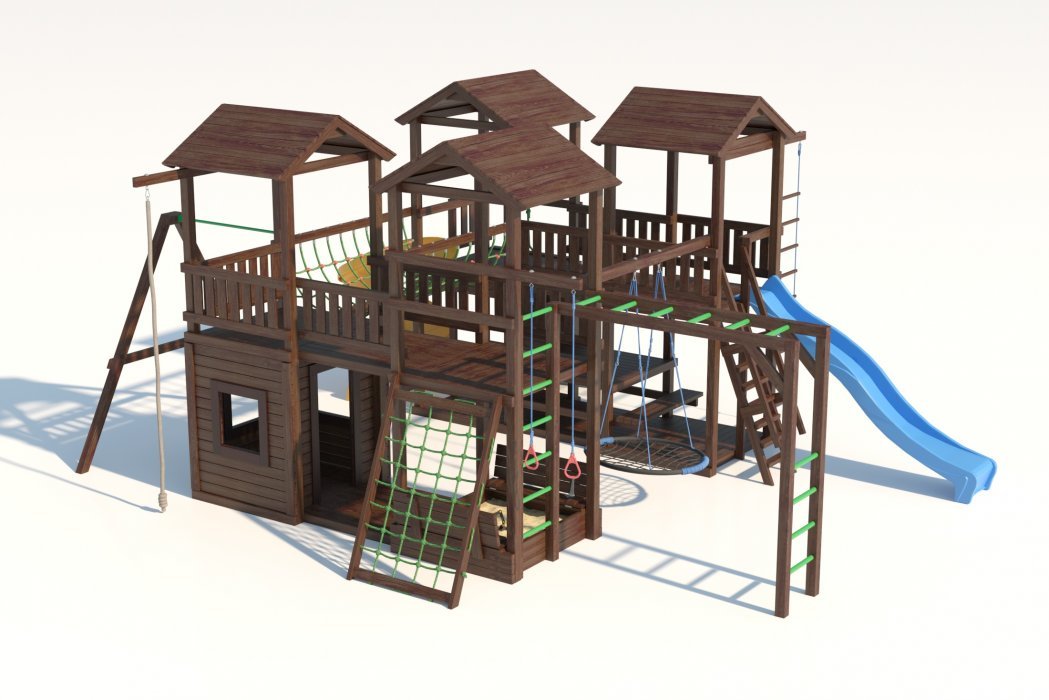 Основа детской игровой - спортивной конструкции – четыре башни с игровой платформой соединены мостиками и качельной балкой. Конструкция оснащена двускатными деревянными крышами, встроенным домиком, встроенным столиком с лавками, встроенной песочницей и дополнительной платформой в нижней части конструкции, пластиковыми волнообразным скатом и винтовым скатом с превосходной скользящей поверхностью, деревянной лестницей, широким скалодромом, канатной лестницей, деревянным рукоходом, шведской стенкой, сидением качели «гнездо», гимнастическим канатом, гимнастическими кольцами и подвесной лестницей. Для безопасности ребенка предусмотрены перила на лестнице, заборчики и ограждения над зонами препятствий (скалодром, канатная лестница, скат).